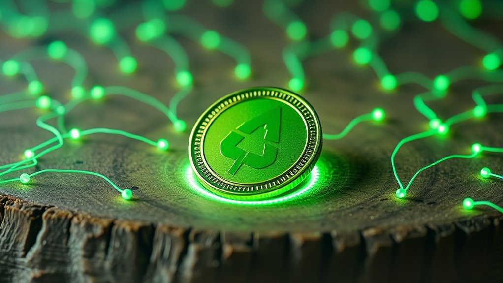 Green token adoption markedly boosts your trust and encourages participation by highlighting a project’s commitment to positive environmental impact. When you see tokens backed by clear sustainability goals, you’re more confident that your investments support eco-friendly initiatives. This transparency fosters a sense of shared responsibility, making you more likely to engage and stay committed, knowing your involvement contributes to reducing environmental harm and advancing sustainable practices in finance.