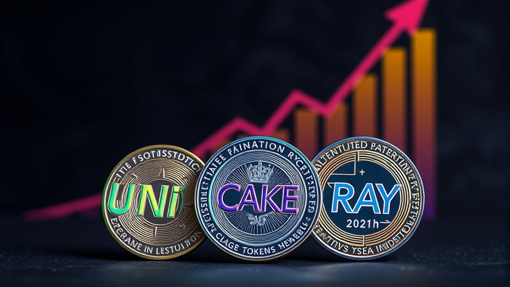 DEX tokens like UNI, CAKE, and RAY have evolved from simple utility assets to key ecosystem components that support governance, incentivize liquidity, and foster community participation. UNI empowers users to vote on platform proposals, CAKE offers governance alongside lotteries and yield farming, while RAY enables staking for rewards. Their growth reflects a shift toward decentralized decision-making and ecosystem expansion—exploring these differences reveals how each token shapes its platform’s future.