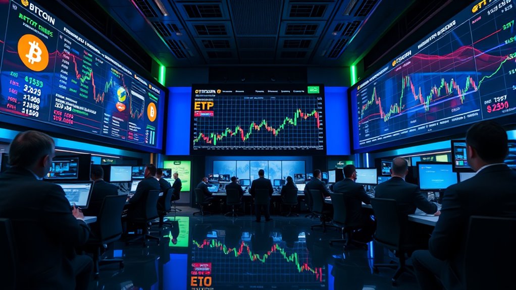 Regulatory approval can boost Bitcoin ETF liquidity by attracting more investors and increasing trading volume, which stabilizes prices. However, regulatory changes often lead to market volatility as traders react to new rules or uncertainties. You should stay alert to these shifts, as they can cause short-term price swings and impact ETF liquidity. Overall, clear regulations tend to enhance stability, while sudden changes can create temporary disruptions.