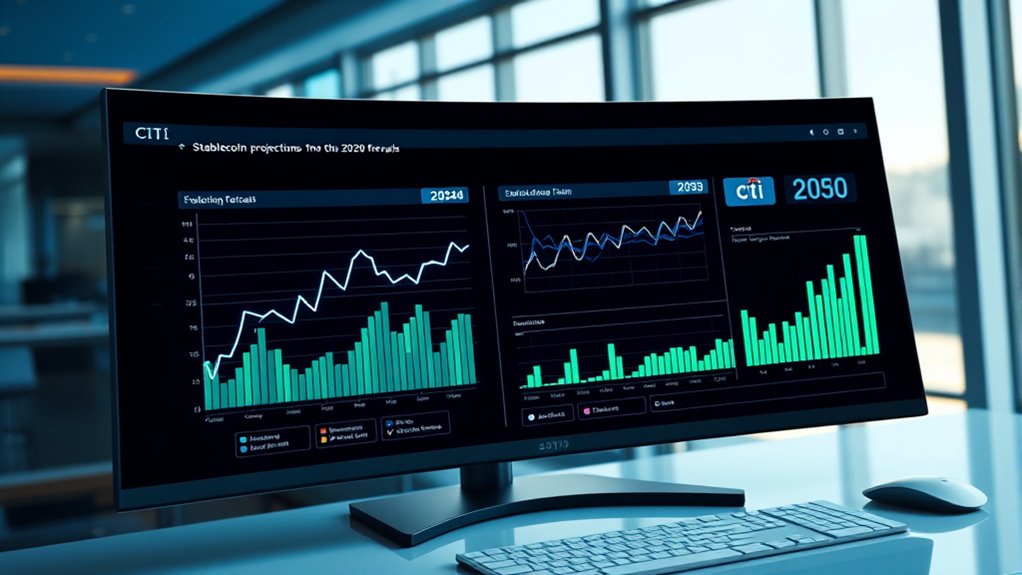 Citi forecasts that by 2030, stablecoins could become a key part of the global financial system, thanks to advances in blockchain technology and changing regulations. They’ll likely be widely adopted for everyday transactions, international trade, and investments, helping bridge traditional finance and decentralized systems. While regulatory uncertainty remains a challenge, ongoing technological innovations and clearer rules will shape their growth. To discover the full picture of how these developments unfold, keep exploring the evolving landscape ahead.