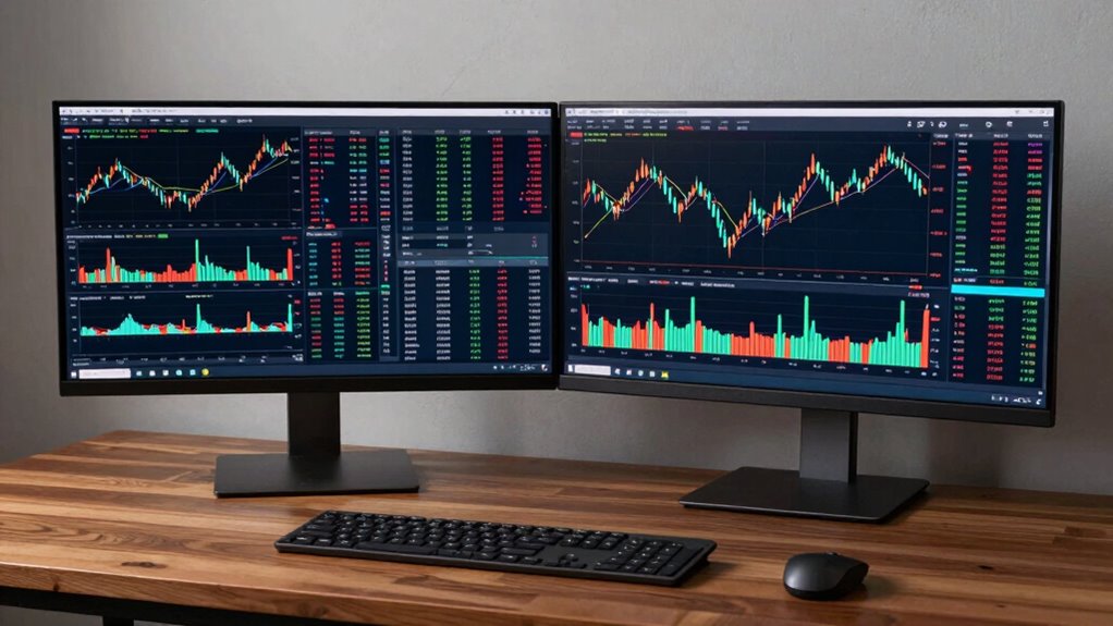 When it comes to trading cryptocurrencies, having the right monitor setup can considerably impact your efficiency and decision-making. Your choice between dual monitors and an ultrawide screen hinges on how you prioritize screen resolution, workspace organization, and ergonomic comfort. With dual monitors, you get the flexibility to customize each display—perhaps one for live charts and the other for news feeds or trading platforms. This setup allows you to expand your screen real estate without sacrificing image quality, especially if you opt for high-resolution screens. A key advantage here is the ability to position your monitors for optimal ergonomics, reducing neck strain and eye fatigue during long trading sessions.