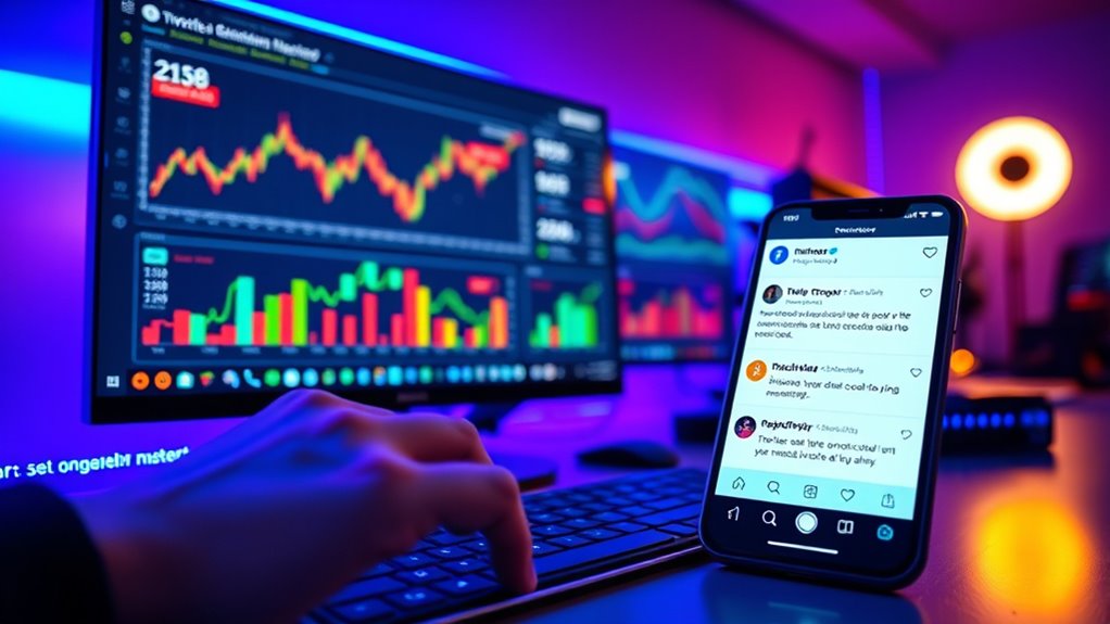 Relying solely on social media sentiment exposes you to risks like market manipulation and emotional bias. You might base trades on false hype or panic, leading to poor decisions. Market manipulation can skew sentiment data, making signals unreliable. Emotional bias clouds your judgment, causing impulsive trades. To mitigate these risks, combine social media insights with technical analysis and fundamental research for a more balanced, informed approach.