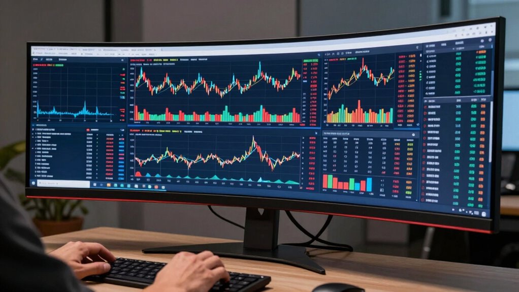 You see, ultrawide monitors truly transform trading by offering a panoramic view of multiple charts and data streams simultaneously. Imagine you’re analyzing currency pairs and stock trends side by side—like a trader who doubled their efficiency by switching to an ultrawide setup. This setup minimizes switching tabs and boosts decision-making speed. So, if you’re serious about trading, investing in an ultrawide monitor could be the game-changer you need to stay ahead in the fast-paced markets.