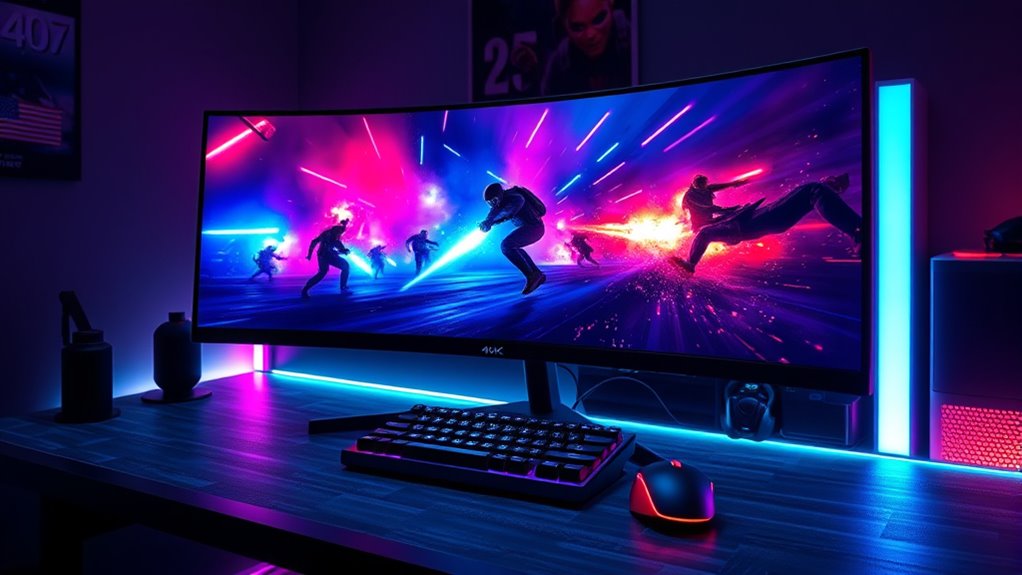 Response time critically impacts gameplay on 4K displays by affecting how quickly pixels update, which influences motion clarity. A lower response time reduces motion blur and ghosting, making fast-paced action smoother and more immersive. When I pick a monitor, I look for one with a response time of 1-2 milliseconds to guarantee that fast movements look sharp and fluid, giving me the competitive edge and a better gaming experience overall.