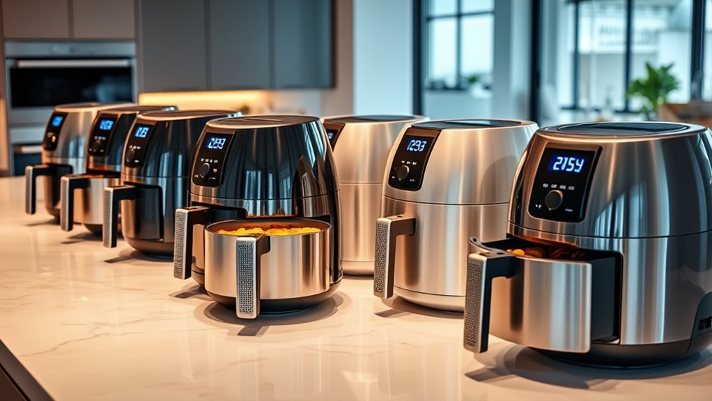 I’ve explored the top 14 air fryers set to transform your cooking in 2025, from compact models perfect for singles to large, multi-function units great for families. These appliances offer advanced technology, versatile features, and sleek designs that make meal prep easier and healthier. Whether you’re after speed, efficiency, or capacity, there’s an option for you. Keep going, and I’ll show you how to pick the best one for your kitchen needs.
