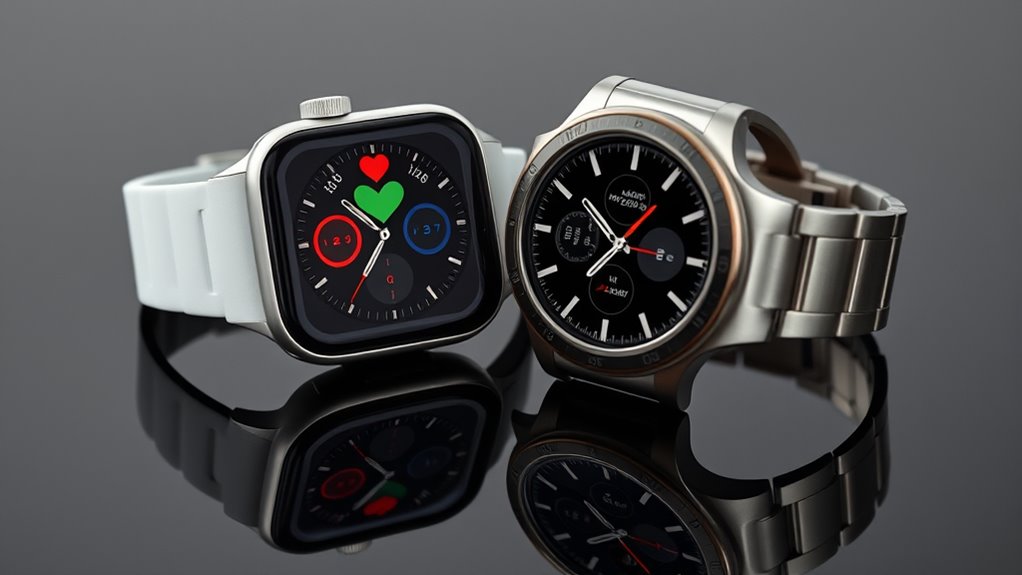 Durability and materials are key factors to contemplate when selecting between the Apple Watch Series 11 and Ultra 3, as they directly influence how well each watch withstands daily wear and extreme conditions. The Series 11 features a superdurable, scratch-resistant glass display that’s twice as resilient as previous models, making it well-suited for everyday use. In contrast, the Ultra 3 boasts a Black Titanium Case made from aerospace-grade titanium, offering exceptional strength-to-weight ratio and corrosion resistance. Its DLC-coated titanium provides higher hardness and wear resistance compared to standard stainless steel or aluminum cases. Additionally, the Series 11’s water resistance rating of 50 meters and dust resistance (IP6X) ensure durability in various environments. Overall, Ultra 3’s titanium construction emphasizes lightweight toughness for extreme activities.