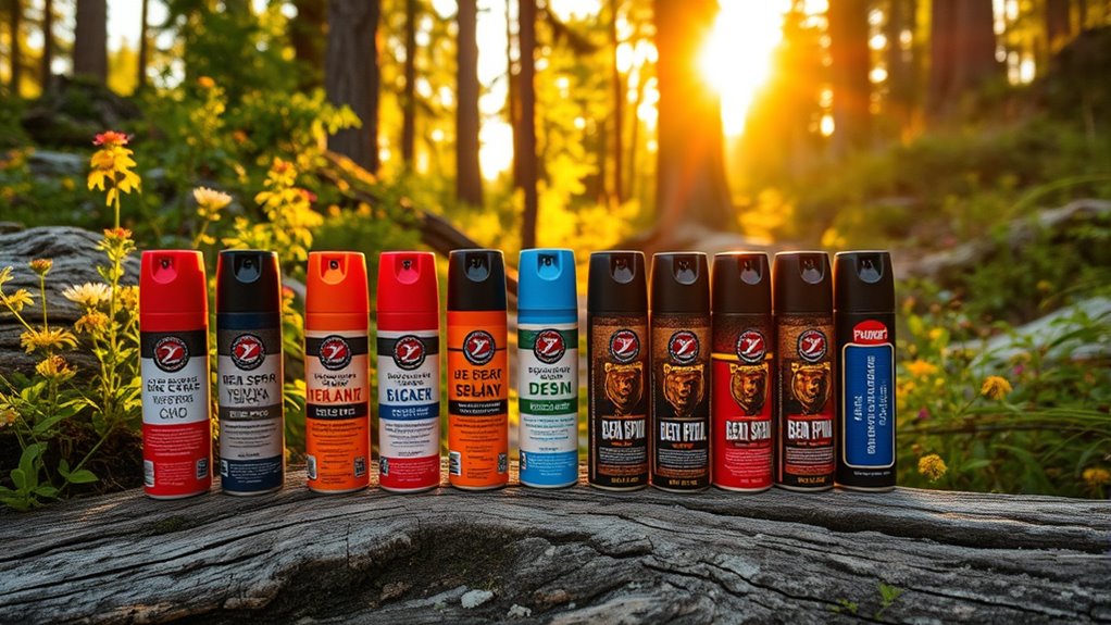 If you’re looking for reliable bear sprays, I recommend options like SABRE’s MAX models, which offer long-range fog coverage and proven effectiveness with safety features like glow-in-the-dark caps and quick-release mechanisms. Kits that combine sprays with deterrent horns or extra safety features can give you added confidence in the wild. These top picks are EPA-registered, eco-friendly, and designed for quick access, so you can stay safe. Keep going to learn more about each one.