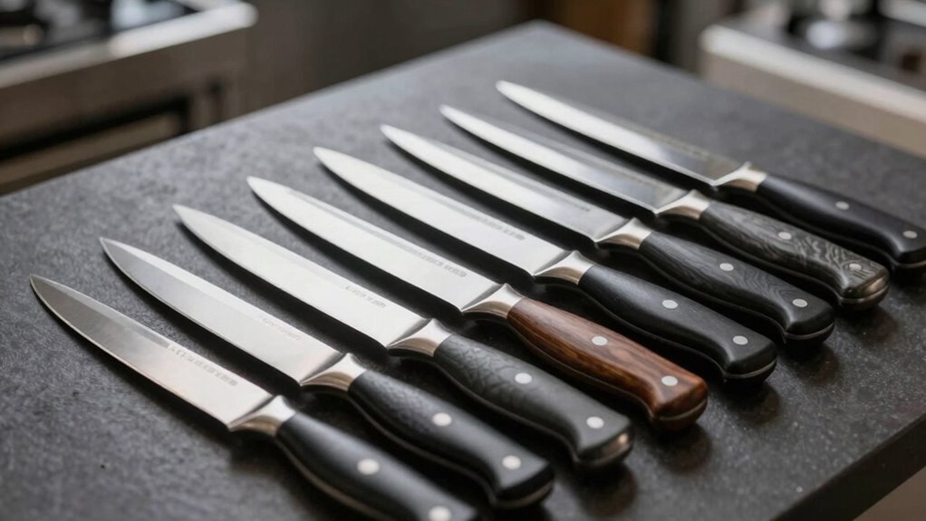Yes, specific handle materials can make a big difference during prolonged kitchen use. I find that ergonomic handles made from non-slip materials like rubber or textured composites provide better comfort and grip, reducing fatigue. Stainless steel handles are durable but can get slippery when wet. For long hours, I recommend a handle that feels comfortable, offers a secure grip, and is resistant to moisture, helping you work efficiently without discomfort.