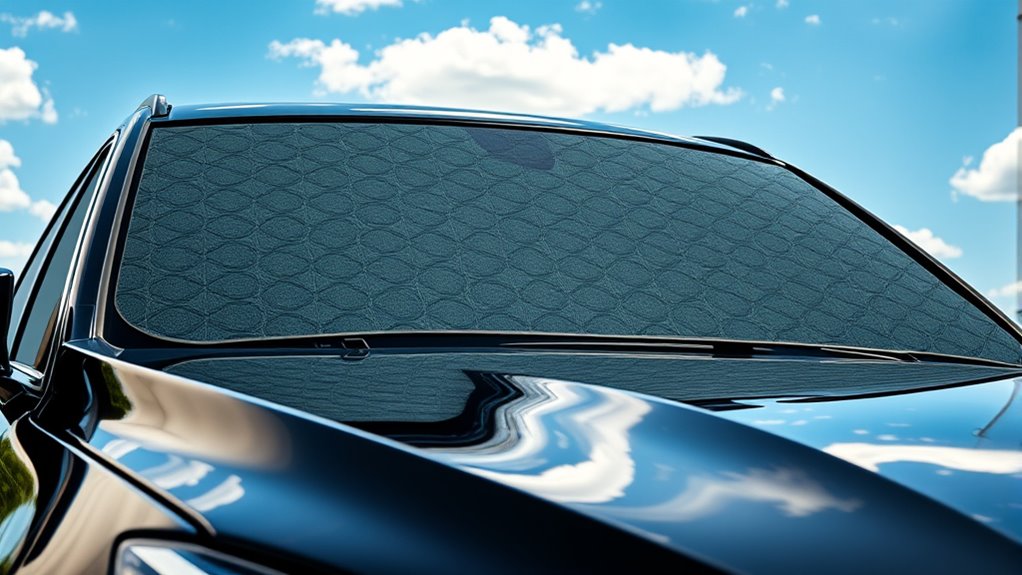 Have you ever wondered what makes a car sun shade truly effective at keeping heat out? The key is its heat rejection efficiency, which depends on the material’s reflectivity and insulation properties. Reflective materials like aluminized polyester or coated fabrics can block up to 99% of infrared heat, lowering interior temperatures markedly. The design also matters—full coverage and a snug fit minimize gaps where heat can sneak in, boosting performance. Multi-layer constructions and advanced coatings create additional barriers, further reducing heat transfer. Proper installation is essential; gaps or overlaps can compromise the shade’s effectiveness. When choosing a sun shade, look for high reflectivity, good insulation, and a precise fit to maximize heat rejection and keep your vehicle cooler.
