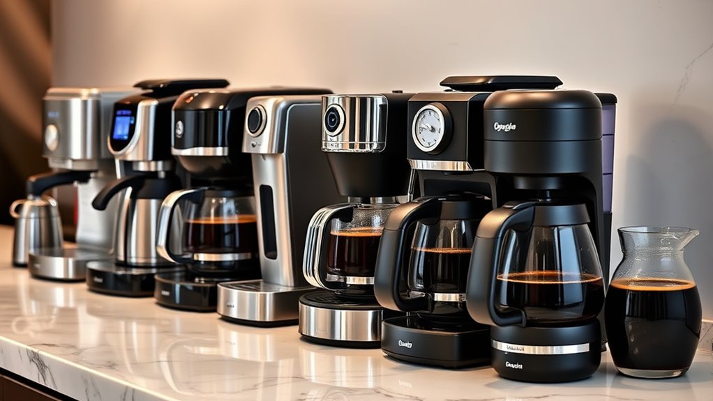 If you’re searching for the 15 best coffee makers to brew the perfect cup every time, I’d recommend models that offer versatile brewing options, precise temperature control, and programmable features. Think reliable drip machines, single-serve options with pod compatibility, and combination units like the Keurig K-Duo or Ninja brewers. Choosing one with good water filtration, thermal carafes, and easy maintenance guarantees consistent flavor. Keep going to discover the top picks that match your style and needs.