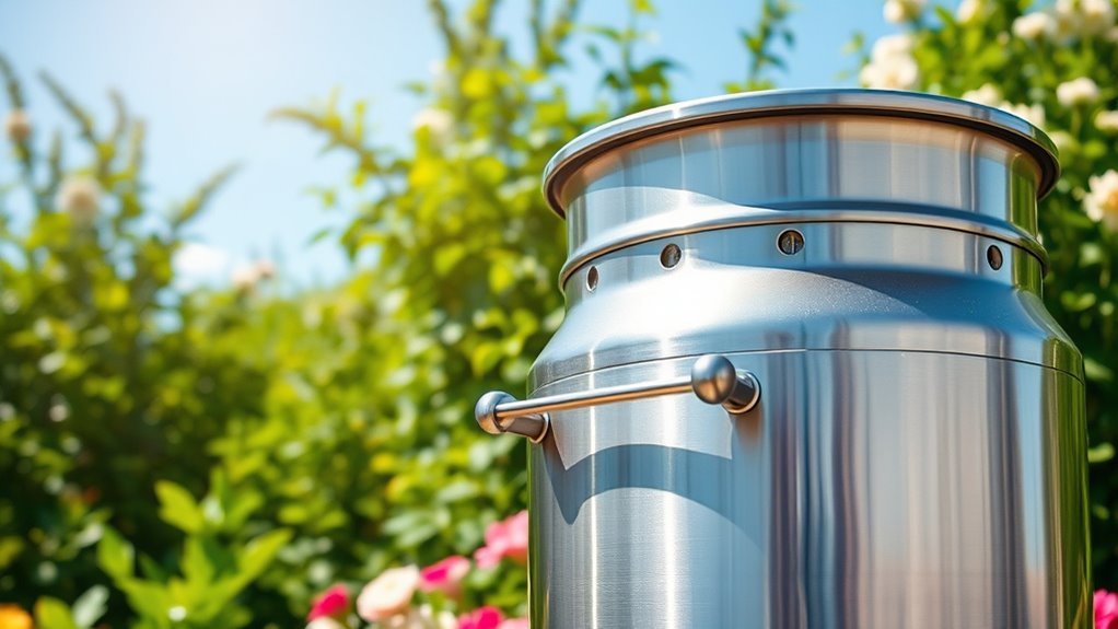 Selecting a durable compost tumbler requires paying attention to the materials used in its construction, as these determine how well it withstands outdoor conditions. High-quality materials like BPA-free polypropylene, galvanized steel, or powder-coated steel are essential for durability, resisting weather and impact. UV-inhibited plastics prevent cracks and degradation caused by sun exposure, extending the tumbler’s lifespan. Heavy-duty elements such as thick plastic panels and reinforced steel frames add strength and deter wildlife interference. Proper sealing of joints with waterproof compounds like silicone helps prevent moisture damage. Additionally, choosing corrosion-resistant metals and weatherproof coatings ensures the tumbler remains structurally sound over years of outdoor use. Prioritizing material durability guarantees your composting setup stays functional and reliable through changing seasons.