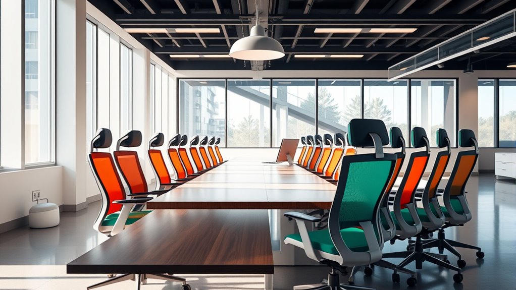 Choosing an ergonomic office chair with adjustable support features is essential for customizing your seating to fit your body perfectly. Adjustable lumbar support lets me move it vertically and horizontally to match my lower back’s natural curve, reducing strain and encouraging better posture. A good headrest can be raised, lowered, or angled to support my neck and head, preventing fatigue during long hours. Flexible armrests that adjust up, down, forward, backward, and rotate help me find comfortable arm positions and reduce shoulder tension. Multiple support adjustments, like tilt lock and tension control, let me personalize the recline and support levels, which enhances comfort and alleviates back pain. These features ensure I stay comfortable and supported throughout the day, making my workspace healthier and more efficient.