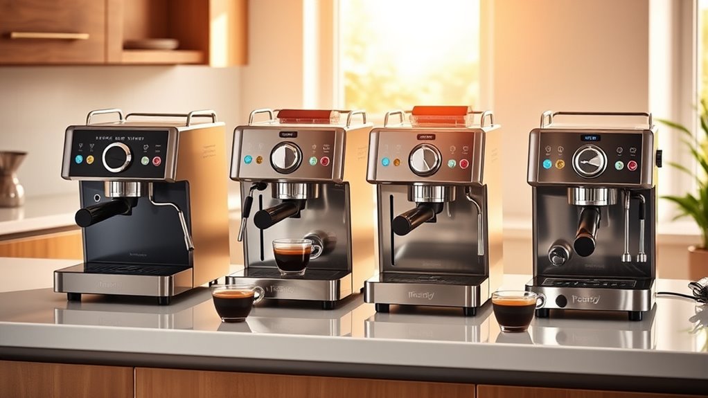 Choosing an espresso machine that’s easy to use can make all the difference for beginners. Machines with intuitive controls and simple interfaces help you operate without extensive training or frustration. Automatic features, like pre-programmed shot sizes and auto milk frothing, markedly reduce the learning curve, letting you focus on enjoying your coffee. Clear instructions and visual indicators guide you through each step, making the brewing process straightforward and less intimidating. Built-in timers or programmable settings also allow you to set your preferences and automate parts of the process, saving time and effort. Additionally, a compact, user-friendly design with minimal buttons makes the machine less overwhelming and more inviting, so you can start brewing like a pro from day one.