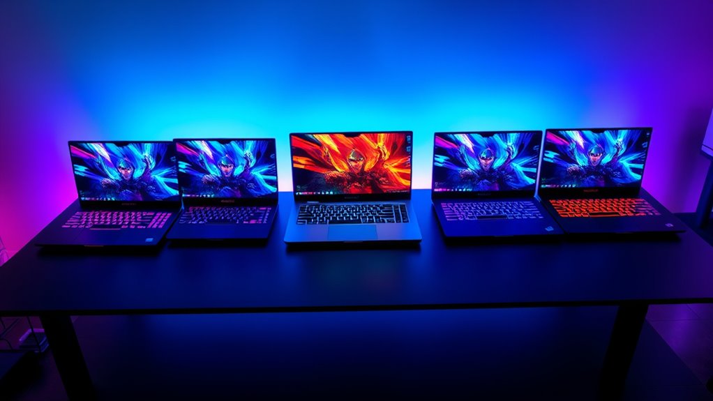 If you’re looking for the best gaming laptops under $1000 in 2025, I’ve got you covered. I’ve found models with powerful processors like AMD Ryzen 7 and Intel Core i7, dedicated GPUs such as RTX 4050 and RTX 5050, and fast SSD storage. These laptops also feature high-refresh-rate displays and ample RAM for smooth gameplay. Want to see which options stand out? Keep exploring, and I’ll share all the details to help you choose the right one.