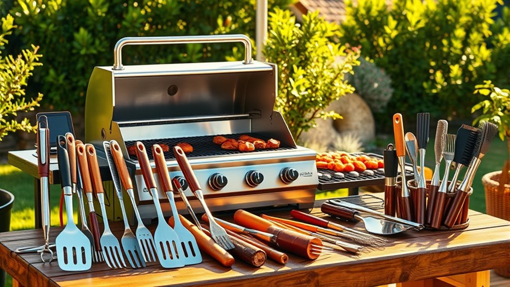 Think of your grill as a canvas, each tool a brush tailored for the masterpiece. I recommend stainless steel tools for most grills, versatile for both gas and charcoal. For Weber grills, a long-handled spatula helps reach the flames, while for ceramic grills, a gentle silicone brush is gentle yet effective. Matching tools to your grill guarantees precision and care, elevating your barbecue game to artful perfection.
