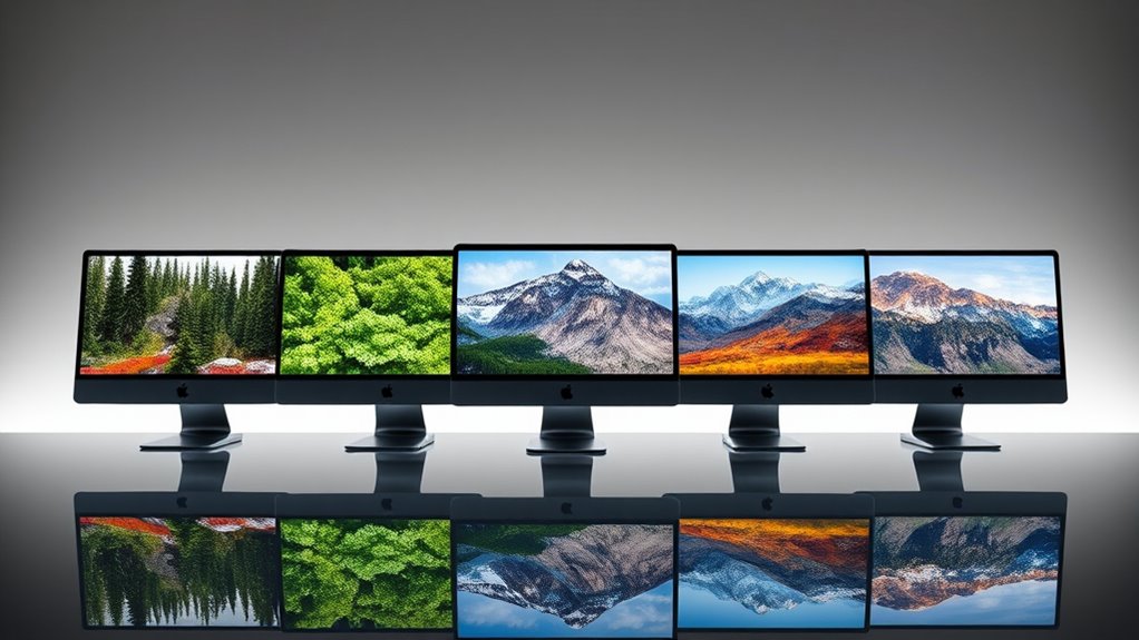 Choosing an iMac with excellent color accuracy is essential for producing professional-quality photos. Look for models supporting up to 1 billion colors, which allows for detailed photo editing and precise color grading. A Retina 4.5K display paired with Nano-Texture Glass ensures vibrant, true-to-life colors, making every detail pop. Brightness, measured in nits, impacts how well colors are visible in different lighting; 500 nits offer great clarity across various environments. Factory calibration or built-in color calibration tools help maintain consistent accuracy over time, saving you the hassle of manual adjustments. Support for wide color gamuts like P3 expands the range of colors your display can reproduce, a crucial feature for professional photographers aiming for perfect color fidelity in their work.