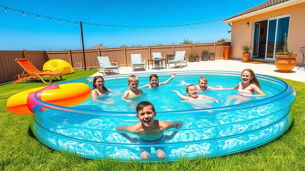 When it comes to enjoying summer days with family and friends, the Sumbee Inflatable Kiddie Pool stands out as a versatile choice for both kids and adults. Its size, approximately 103 x 69 x 20 inches, comfortably fits 2 adults or 3-4 children, making it perfect for gatherings. Made from durable, eco-friendly PVC with UV protection, it guarantees safety and longevity. Setup is quick—about three minutes with an electric or hand pump—and deflates easily for storage. Whether used as a kiddie pool, water toy, or even a fishing pond, it offers endless outdoor fun while prioritizing safety and convenience.