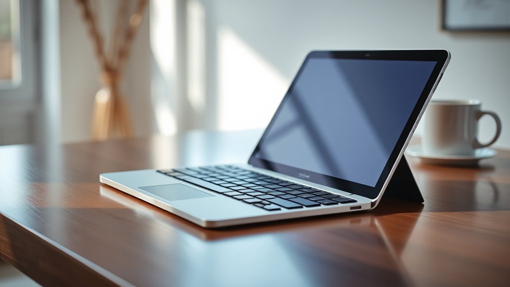 Beyond portability and weight, additional functionalities can substantially boost your productivity and overall experience with an iPad keyboard. Features like backlit keys, multi-touch trackpads, and dedicated shortcut keys make multitasking easier and more efficient, especially in low-light conditions. Customizable options such as adjustable RGB lighting and gesture support allow you to tailor your workspace to your preferences and lighting environments. Some keyboards offer versatile modes, including detachable or convertible designs, letting you switch seamlessly between laptop, tablet, and presentation modes. Power management features like auto sleep/wake and long-lasting batteries ensure you stay productive without frequent recharges. Compatibility with multiple operating systems and extra ports or stylus holders can further extend functionality, making your keyboard a versatile tool tailored to your workflow.