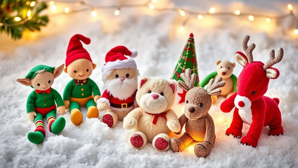 The material quality of Jellycat Christmas collection items considerably impacts their overall appeal and longevity. I look for plush toys made with high-grade, carefully sourced fabrics that feel soft, subtle, and durable. Multi-layer construction and hand-finished details help maintain their softness and shape, even after lots of cuddling. I also prioritize safety, so I choose toys made from fabrics that meet strict standards like EN71, ensuring they’re safe for all ages, including infants. The collection’s velvety fur and textured fleece add to their tactile appeal and help them stay vibrant over time. Attention to sourcing and manufacturing means these plush toys keep their color, softness, and form, making them reliable, long-lasting gifts for the holidays.