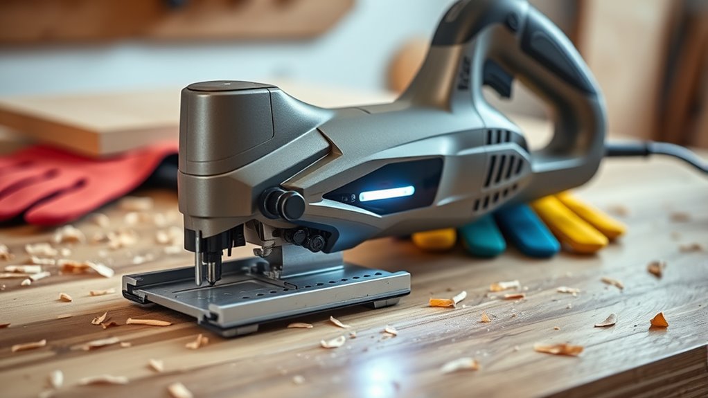 When choosing a jigsaw, prioritizing design and ergonomics guarantees comfort, control, and safety during use. A well-designed handle reduces hand fatigue and offers a comfortable grip, even during extended projects. Lightweight construction enhances maneuverability, making it easier to work in tight spaces or perform intricate cuts. Adjustable features like variable speed triggers and bevel settings allow for precise control tailored to different materials and tasks. The placement and design of controls should enable easy operation with minimal strain, ensuring safer and more accurate cuts. Additionally, a dust blower or collection system improves visibility of the cutting line, which is essential for safety and precision. Overall, a thoughtful ergonomic design makes a significant difference in your comfort and the quality of your work.