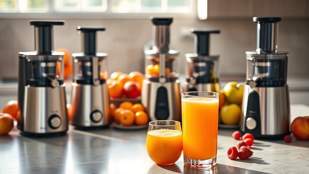 If you’re looking to elevate your morning routine, I recommend checking out the 15 best juicers that combine speed, efficiency, and health benefits. From cold press models with wide feed chutes to powerful centrifugal options, these juicers handle everything from leafy greens to hard fruits with ease. They’re easy to use and clean, perfect for busy mornings. Keep exploring to find out which one fits your lifestyle best and transforms your juice game.