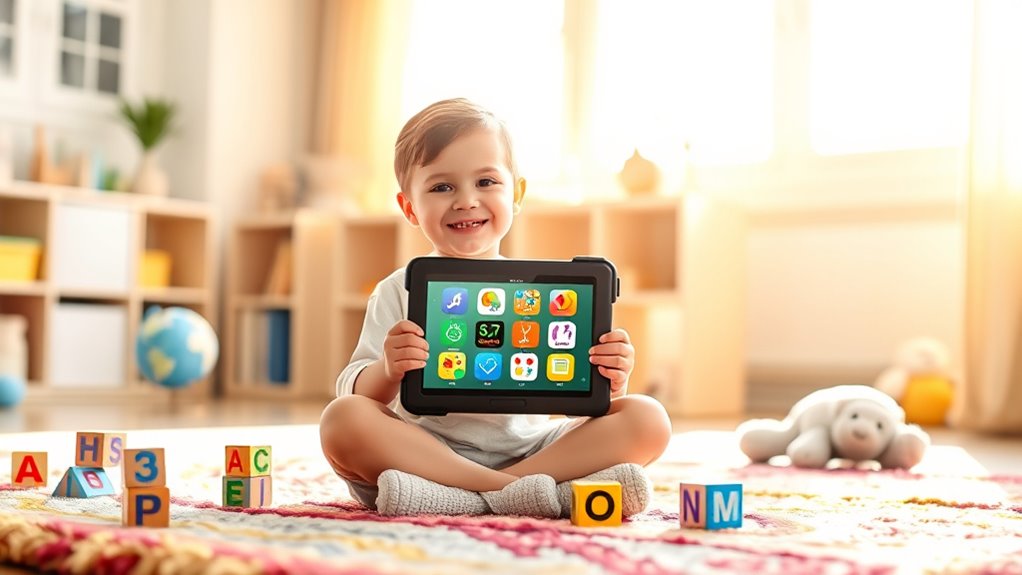 Choosing a kids tablet with strong safety features is essential to guarantee a secure and worry-free digital experience. I look for devices with robust parental controls that let me manage content, set time limits, and control app access remotely. Built-in safeguards like kid-proof cases, impact-resistant screens, and durable construction help withstand rough handling and accidental drops. Privacy features are equally important; I check for restricted data sharing, secure login options, and compliance with child privacy laws like COPPA. Safe browsing tools, including keyword filtering and website restrictions, ensure my child only accesses appropriate content. Additionally, features like adjustable font sizes, screen dimming, and blue light filters protect their eyesight during extended use. These safety features give me peace of mind while they enjoy their tablet.
