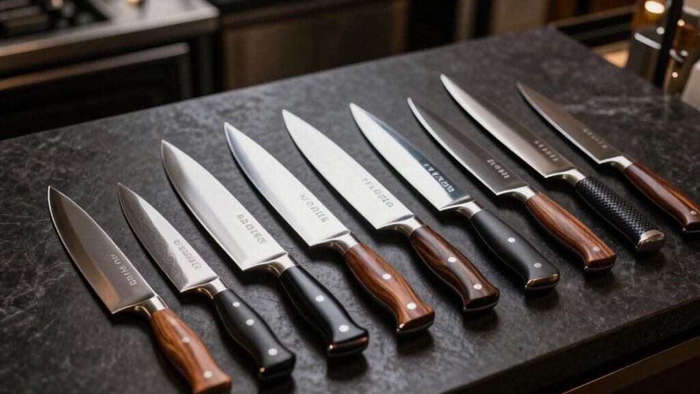 Knife handle materials critically impact performance because they affect grip, comfort, and durability. I prefer handles made from materials like pakkawood or textured synthetic composites since they provide a secure grip even when wet. Lightweight, well-balanced handles reduce hand fatigue during long hours in the kitchen. Ultimately, choosing the right handle material depends on your cooking style and preferences, but prioritizing comfort and grip ensures better control and safety.