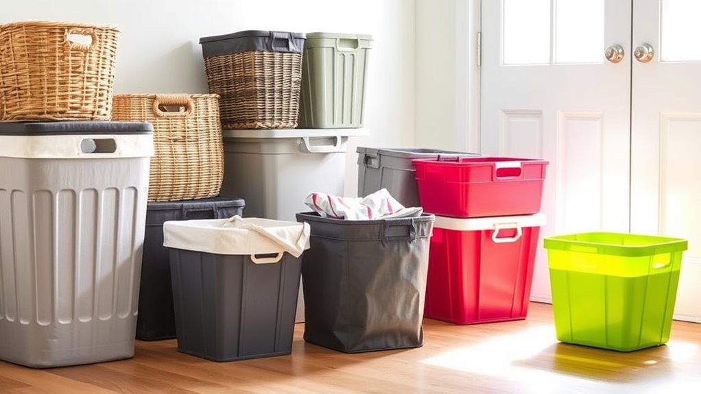 I find that metal and hard plastic are the most durable materials for laundry hampers. Metal frames, especially stainless steel, resist rust and last for years, while sturdy plastic options can withstand daily use without cracking or breaking. I avoid flimsy materials like thin fabric or cardboard because they don’t hold up well over time. Choosing a hamper made from strong, resilient materials guarantees it stays functional and looks great longer.