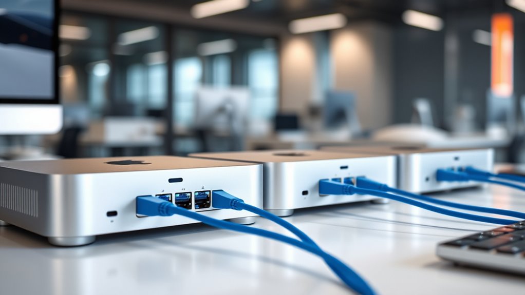 Ensuring your Mac mini has the right port configuration is essential for leveraging its 10Gb Ethernet capabilities. First, check if it has a dedicated Gigabit Ethernet port that can be upgraded or configured for 10Gb speeds. Verify the number and type of ports available, especially if you need multiple high-speed connections alongside Ethernet. It’s important to know whether the Ethernet port supports native 10Gb speeds through the built-in hardware or if you’ll need an external adapter. Compatibility with your existing network infrastructure is vital to achieve peak performance. Lastly, consider the port’s placement for easy cable management and seamless connectivity within your setup. Making sure these factors align ensures your Mac mini can deliver the speed and reliability you need.