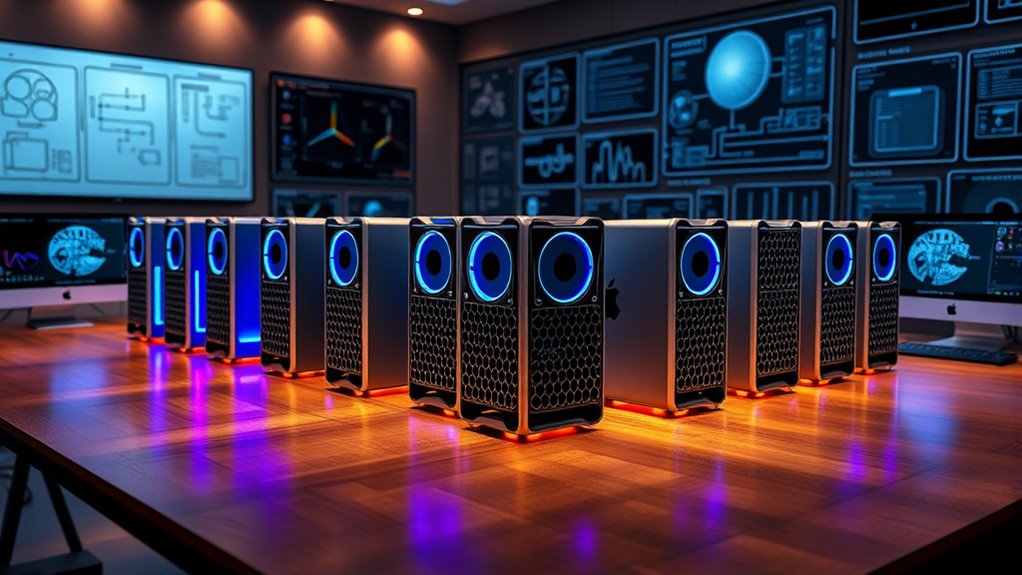 If you’re looking for the best Mac Pro models for 3D rendering and simulation in 2025, I recommend high-end options like the M4 Max-equipped MacBooks and the latest Mac minis with powerful chips. These machines combine top processing power, ample memory, and advanced graphics, making them ideal for demanding workflows. Choosing the right model depends on your workflow needs and portability preferences. Keep going to discover detailed insights and expert reviews that can help you make the perfect choice.
