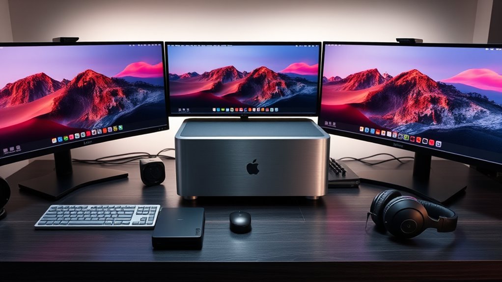 When choosing a Mac Pro for professional video post-production, it’s essential to verify that it can support the high-resolution displays required for accurate editing and color grading. Make sure it can handle resolutions like 6K at 60Hz or 8K at 60Hz, which are vital for detailed workflow accuracy. If HDR color grading is part of your process, confirm compatibility with standards like Dolby Vision, HDR10+, and HLG. Check that the Mac Pro has enough Thunderbolt 4 or Thunderbolt 5 ports to connect multiple high-res monitors simultaneously without issues. Also, verify the display connection standards—DisplayPort or HDMI—match your monitors’ inputs. Lastly, consider the bandwidth limitations of the ports to guarantee smooth playback of high-bitrate 4K, 6K, or 8K video content.