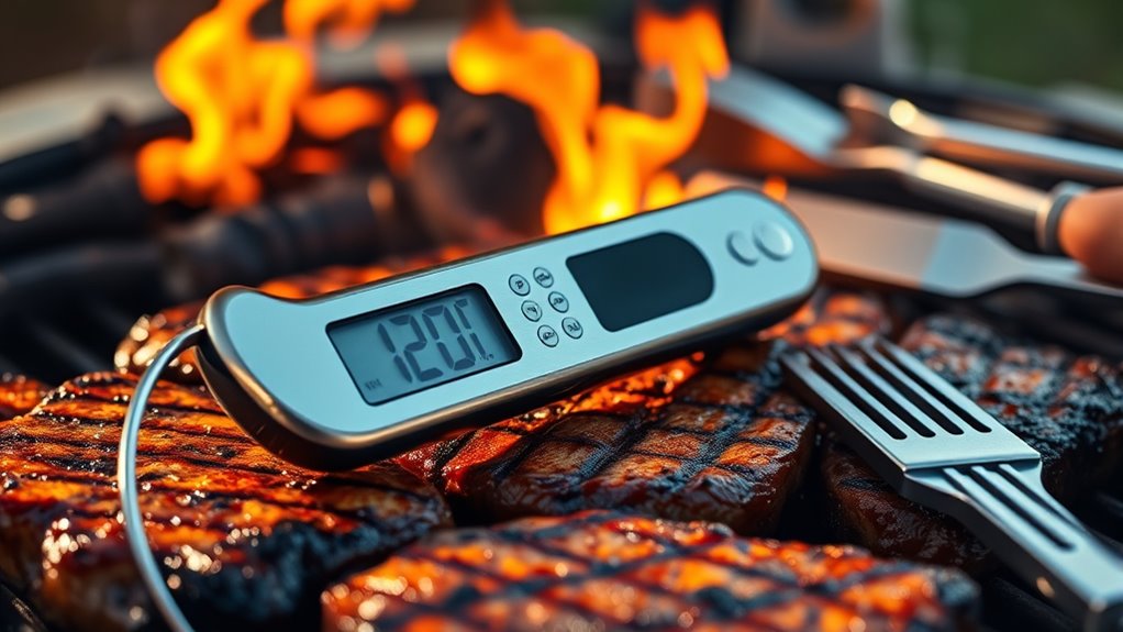 Choosing a meat thermometer that can withstand outdoor grilling conditions means prioritizing durability and waterproofing. Look for models with waterproof ratings like IP65 or higher, which guarantee protection against rain, splashes, and cleaning. Waterproof thermometers can be safely washed under running water, preventing buildup and extending their lifespan. Durability features such as shock resistance and sturdy casings help guard against accidental drops or impacts during grilling. Sealed probes and connections are essential to prevent moisture ingress that could damage internal electronics over time. Make sure the materials and construction meet industry standards for outdoor and kitchen use, ensuring reliable performance in various conditions. Investing in a durable, waterproof thermometer means you’ll enjoy consistent accuracy and longevity through countless grilling sessions.