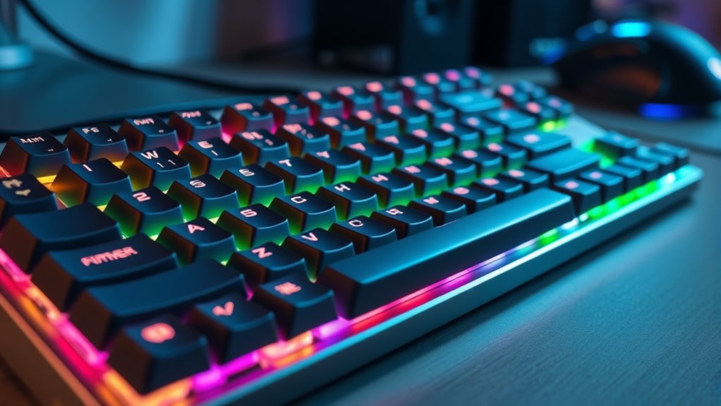 Customization features can markedly enhance your mechanical keyboard experience by allowing you to tailor it precisely to your needs. Hot-swappable switches let you easily change tactility, sound, and switch types without soldering, giving you flexibility to find your perfect feel. Programmable keys and macro support enable you to create personalized workflows, gaming commands, and shortcuts that suit your style. RGB or backlit lighting, controlled via software, offers extensive visual customization, including effects, colors, and dynamic patterns that match your setup. Some keyboards support firmware updates or third-party software, providing advanced options for remapping keys and designing custom lighting profiles. Additional features like removable keycaps, adjustable sound dampening, and dedicated control knobs add further physical and aesthetic customization options, making your keyboard uniquely yours.