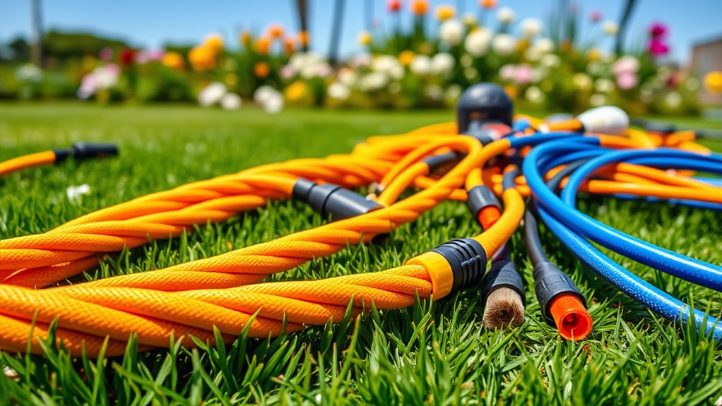 Choosing the right outdoor extension cord means paying close attention to the materials that guarantee its durability. Heavy-duty jackets made from reinforced vinyl or polyethylene shield the cord from wear, abrasion, and environmental damage. I look for cords with pure copper conductors because they offer reliable conductivity and help prevent overheating or electrical failure. Weather-resistant materials, like IP65-rated waterproof jackets, protect internal wiring from rain, snow, moisture, and UV rays, substantially extending the cord’s lifespan. Cold-resistant insulation keeps the cord flexible in low temperatures, avoiding cracking or brittleness during harsh winters. Reinforced strain relief at connection points is also vital; it prevents breakage and maintains electrical integrity during frequent bending and heavy use. These materials ensure my outdoor extension cords remain durable and dependable over time.