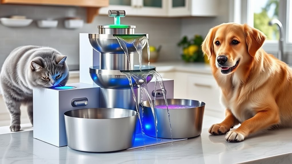 Choosing a pet water fountain that complements your home’s decor can make a noticeable difference in how seamlessly it fits into your space. I recommend selecting a design that matches your style, whether sleek stainless steel for a modern look or colorful plastic for a playful vibe. Aesthetic features like LED lights, transparent water levels, and flowing streams not only enhance visual appeal but also encourage pets to drink more. The size and shape should fit comfortably in your indoor area without creating clutter or disruption. Modern designs often incorporate easy-to-clean materials and simple assembly, making maintenance hassle-free. Incorporating visual cues like bubbling water can attract your pet’s attention and promote hydration, while adding a decorative touch to your home.
