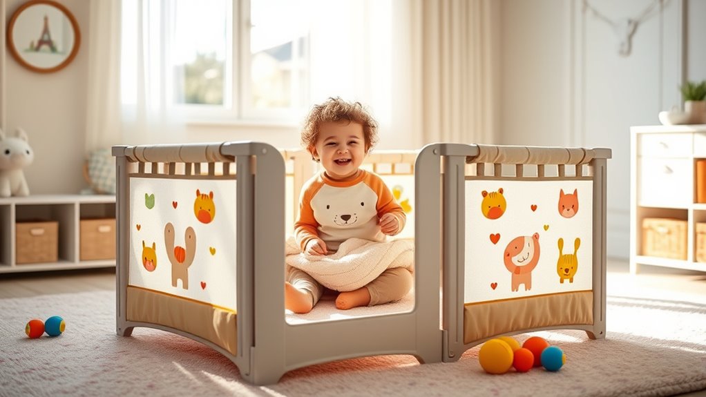 Adding extra features to a playpen can considerably boost its usefulness and keep your little one engaged. Built-in storage pockets make it easy to keep toys, diapers, and essentials close at hand. Toy bars or integrated activity centers encourage crawling, standing, and coordination, stimulating your child’s development. Safety accessories like soft padding, anti-slip suction cups, and lockable doors provide peace of mind during active play, preventing accidents. Convenience features such as tool-free assembly, foldability, and carrying bags simplify setup and transport, making outings more manageable. Compatibility with mats, toys, or baby monitors allows you to customize the play area for safety and entertainment. When choosing a playpen, consider these additional features to enhance both functionality and your child’s experience.