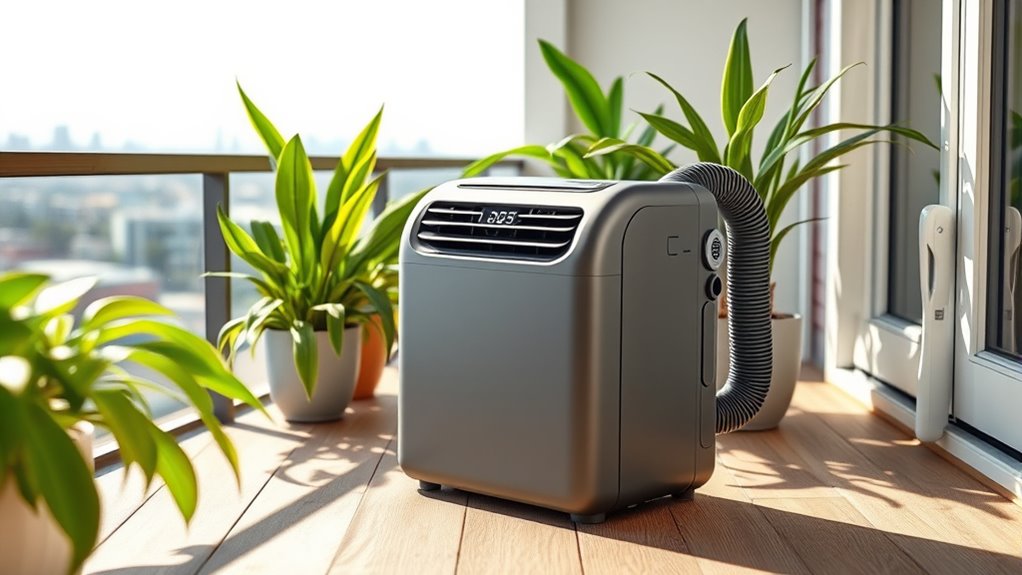 When shopping for a portable air conditioner, paying attention to energy efficiency features can save you money and reduce environmental impact. Look for models with energy-saving modes like sleep or eco mode, which automatically adjust compressor and fan settings to cut power use. Check the EER rating—aim for units above 10, as higher numbers mean better cooling with less energy. Programmable timers and remote controls help schedule operation, preventing wasteful running times. Advanced inverter technology is also a plus, as it varies compressor speeds to maintain consistent temperatures while consuming less electricity. Additionally, choosing units that use eco-friendly refrigerants like R-32 can boost energy efficiency and lessen environmental harm. These features help you stay cool efficiently and responsibly.