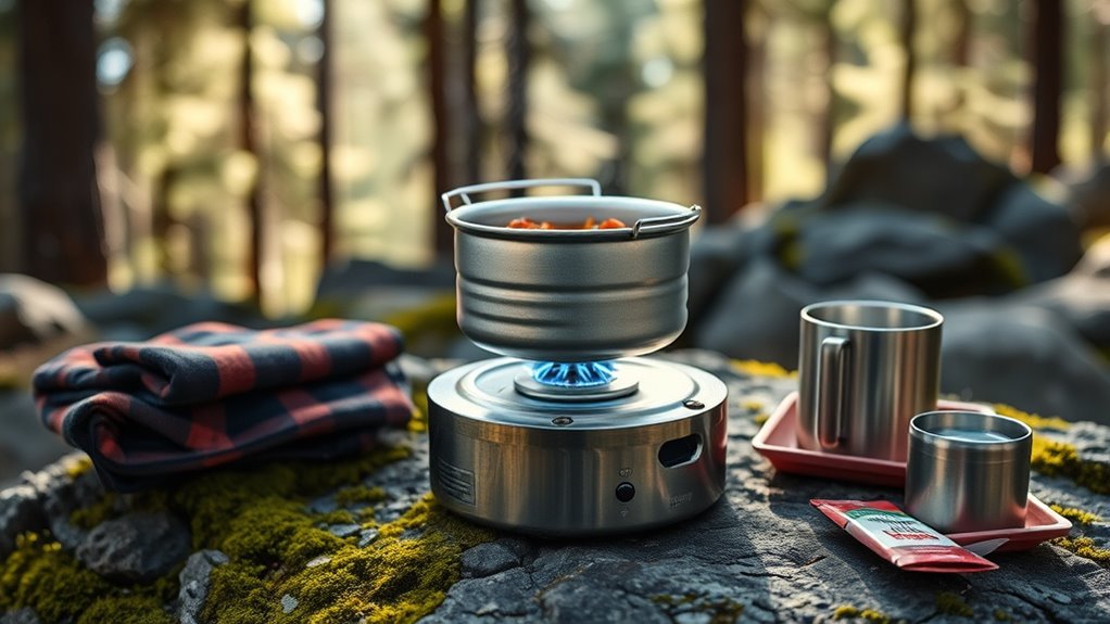 A portable camp stove’s heat output directly impacts how quickly and effectively I can prepare meals outdoors. Measured in BTUs, higher ratings mean more powerful stoves that can bring water to a boil faster and cook large or multiple dishes simultaneously. Most camping stoves fall between 5,000 and 20,000 BTUs, with the higher end suited for quick cooking or heating larger quantities. However, a more powerful stove may also consume fuel more rapidly, so balancing heat output with fuel efficiency is key. Consistent heat, especially in windy conditions, is essential for reliable outdoor cooking. Choosing the right BTU rating depends on your cooking needs and the kind of trips you take, ensuring you can cook efficiently without sacrificing fuel life.