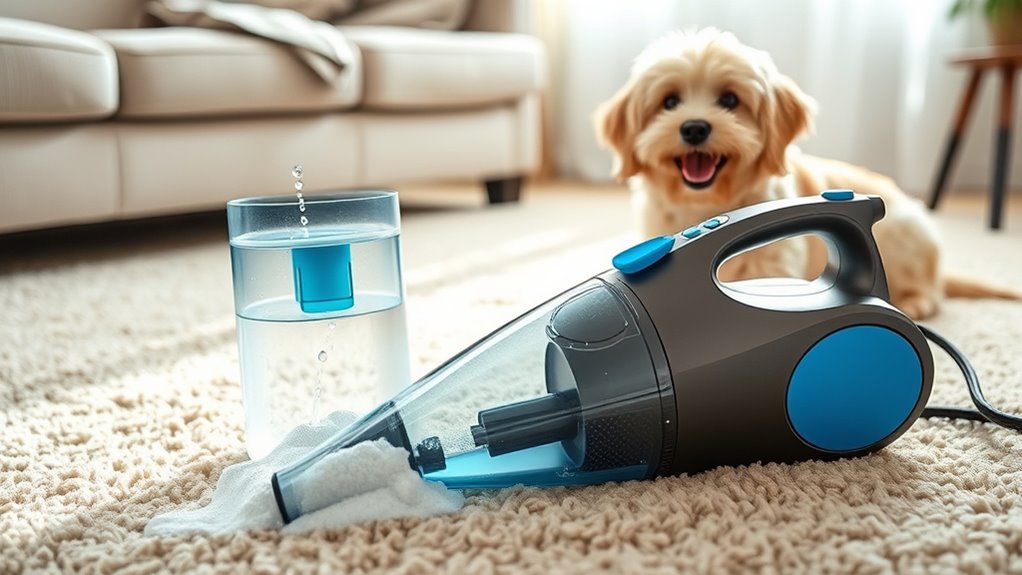 Have you considered how tank capacity impacts your cleaning efficiency? A larger tank means you can clean longer without stopping to refill, which is especially helpful for pet messes that tend to be widespread. Portable carpet cleaners usually have tanks between 0.8L and 2L; choosing a higher capacity means less interruption and more thorough cleaning. Dual tank systems, which separate clean and dirty water, help maintain suction power and ensure consistent results. Keep in mind, bigger tanks add weight and can make the device less maneuverable when full. Smaller tanks require more frequent stops, which can slow down your cleaning process. Balancing tank size with ease of handling is key to making your cleaning sessions more efficient and less frustrating.