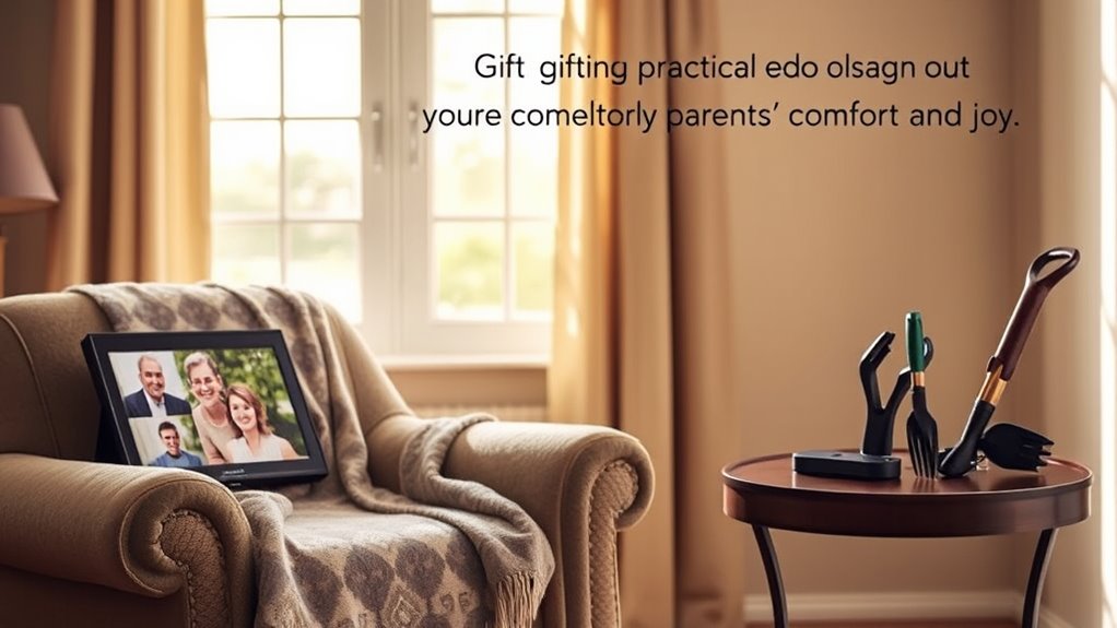 When selecting practical gifts for elderly parents, it’s essential to take into account their physical abilities and health conditions to guarantee the items will be safe and useful for them. A suitable gift should enhance their daily life without causing frustration or harm. Focus on practicality and ease of use to support their independence. Safety is paramount, so choose items that reduce the risk of falls or injuries, like non-slip rugs or grab bars. Make sure the gift aligns with their lifestyle and personal preferences to increase the likelihood it will be appreciated and used regularly. Avoid overly complex or intricate items that might be confusing or difficult to operate. Ultimately, a thoughtful, appropriate gift respects their needs and promotes comfort and safety.