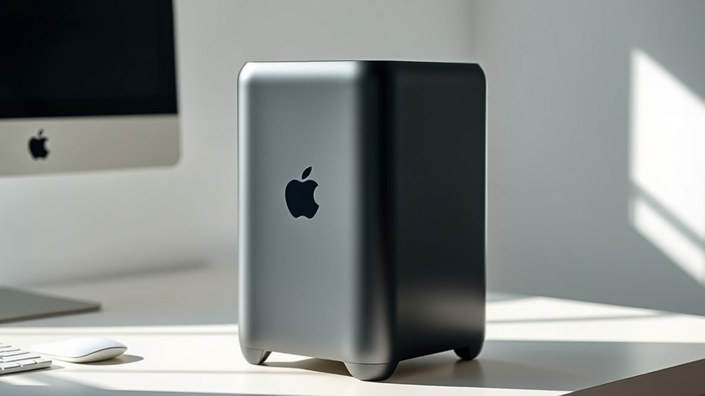 Choosing a renewed Mac Pro desktop requires careful attention to its build quality and design to guarantee durability and performance. Look for models with sturdy construction using materials like aluminum or high-quality plastics, ensuring longevity. A well-designed Mac Pro should have a compact, space-efficient form factor that fits seamlessly into various workspaces without sacrificing power. Good ventilation and cooling systems are vital, especially during intensive tasks, to prevent overheating. The internal layout should optimize airflow and allow easy access to components for maintenance or upgrades. Additionally, reliable ports and connectivity options—such as multiple Thunderbolt, USB-C, and Ethernet ports—are essential for professional workflows, all while maintaining an appealing aesthetic. Prioritizing these factors ensures you select a durable, efficient, and functional renewed Mac Pro.