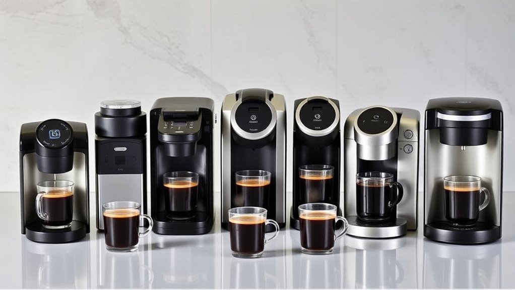 Brewing flexibility is a key factor to contemplate because it allows you to customize your coffee experience to match your preferences. Adjustable brew sizes let you choose from 6 to 12 ounces, perfect for a quick cup or a larger mug. Multiple brew styles, such as strong, over ice, or specialty modes, enable you to tailor the flavor and beverage type. Compatibility with both K-Cup pods and ground coffee offers versatility, giving you more options for different tastes. Some machines include brew strength controls or concentrated brew settings to enhance flavor intensity. Additional features like iced coffee options or customizable temperature controls further expand your brewing possibilities. Overall, these flexibility options guarantee you can craft the perfect cup, every time, suited exactly to your mood and needs.