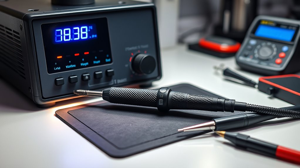 Advanced soldering stations often include safety features like automatic shut-off to prevent overheating, temperature controls for precise adjustments, and insulated tips to avoid accidental burns. I appreciate stations with built-in ventilation or fume extraction to keep the workspace safe. Some also have alert systems or alarms when the tip is too hot or if there’s a fault. These features help me work safely while ensuring peak performance.