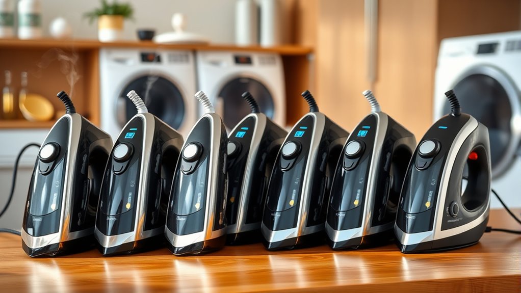 Beyond safety features, the array of additional functions and accessories can considerably enhance your ironing experience. Adjustable steam settings and spray mist functions give me versatility for different fabrics, while vertical steaming allows easy touch-ups on hanging garments. Some models include handy accessories like water measuring cups, anti-calc systems, and self-cleaning functions, simplifying maintenance. Advanced features such as digital LCD screens, preset fabric modes, and auto shut-off boost convenience and safety. Additional accessories like retractable cords, anti-drip technology, and specialized soleplates—ceramic, stainless steel, or titanium-infused—improve glide and durability. Larger water tanks enable longer ironing sessions, and programmable options make customization effortless. When choosing a steam iron, these extras can make a significant difference in ease of use and overall performance.