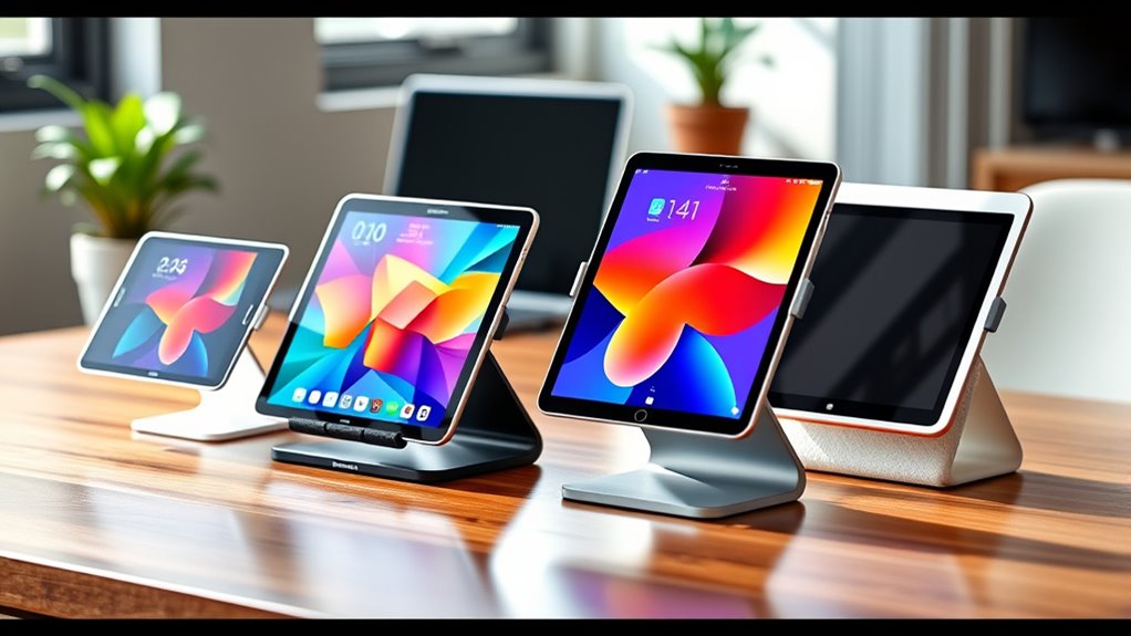 To choose a tablet stand for different device sizes, I look for adjustable or universal stands that can accommodate various thicknesses and dimensions. I prioritize stands with flexible grips or extendable arms, ensuring they securely hold my devices without slipping. I also check for compatibility with my specific tablets, reading reviews to confirm stability and ease of use. This way, I get a versatile stand that works well across all my devices.