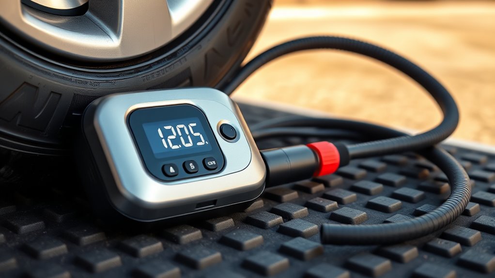 A compact tire inflator is essential for easy storage and quick access, especially during roadside emergencies or outdoor adventures. Usually, models under 7 inches are highly portable, fitting easily into glove compartments, backpacks, or toolkits. Weighing less than 2 pounds, these inflators are perfect for frequent use and quick handling. Their small size often means simpler controls and minimal setup, making them user-friendly for everyone. Portable options with built-in batteries let you inflate tires anywhere without needing an external power source, adding convenience during outdoor trips. However, it’s important to think about the hose length and attachments, as smaller units may have shorter hoses, which can sometimes limit ease of use in certain tire positions. Overall, size and portability are key for on-the-go convenience.