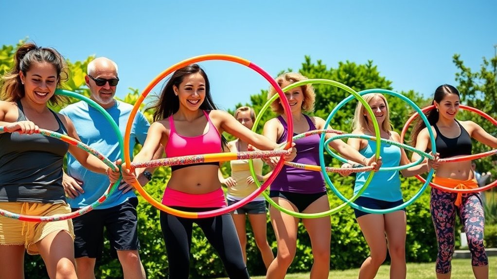 Heavier weighted hula hoops, usually ranging from 2 to 3.3 pounds, offer increased resistance that can enhance your workout intensity. This added weight helps engage more muscles, especially in your core, hips, back, and waist, leading to better toning and strength. Many models feature adjustable resistance levels, so you can customize the challenge to match your fitness level and goals. Higher resistance hoops can also burn more calories—some burn up to 700 calories in just 30 minutes. It’s important to choose a weight that offers effective resistance without causing discomfort or risking injury, particularly if you’re a beginner. Finding the right balance guarantees you get a safe, effective, and enjoyable workout every time.