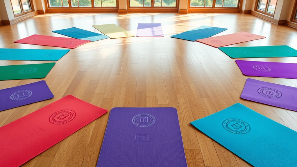 Selecting the right yoga mat depends heavily on the type of exercises you’ll be doing, as different routines demand specific features for ideal support and safety. For floor poses and joint protection, I prefer thicker mats that cushion sensitive areas. Hot yoga or vigorous vinyasa flows require mats with enhanced grip and moisture resistance to prevent slipping when sweating. Pilates and stretching routines benefit from extra cushioning to protect joints during long holds. For standing balance or dynamic movements, I look for mats with a non-slip surface and firmness to maintain stability. The exercise style also influences the material—natural rubber or eco-friendly thermoplastic elastomers often provide better grip and durability for high-impact or sweaty sessions. Matching your mat to your routine ensures safety and excellent performance.